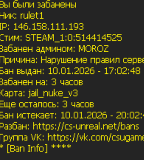 мороз забанил ни за что он написал причину нарушение правил сервера и забанил на 3 часа не знаю за что забанил я просто сидел ждал раунда он даже не предупредил что забанит