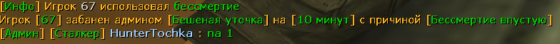 2. Пострадавший: "67 " 3. Суть нарушения: Игрок "Бешеная уточка", находясь в роли администратора , нарушил установленную процедуру применения наказаний за пункт правил "Запрещено использовать бессмертие просто так, бессмертие на одного".